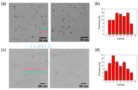 We studied FT-AuNP samples using TEM to measure the gold nanoparticle size distribution of each ferritin homopolymer. AuNPs were directly observed, allowing the measurement of the electron-dense spherical metallic cores, showing that the mean diameter of the nanoparticles was 6 ± 1.8 nm (N = 833) and 5 ± 1.9 nm (N = 444) nm for FTH-AuNP and FTL-AuNP, respectively (Figure 4). Although these results cannot directly demonstrate that AuNPs are inside ferritin’s cavity, the absence of AuNPs with sizes over 9 nm is evidence that AuNPs could be inside the protein, given that the ferritin cavity has a ~8 nm size constraint. Additionally, the negative-stained samples of FTH-AuNP (Figure S3) showed some electron-dense cores inside the ferritin structure, which had an unchanged mean diameter of 11.5 ± 0.8 nm (N = 100). No electron-dense cores are observed outside the protein-stained shell. Nevertheless, the presence of Au atoms on the ferritin surface, driving the formation of the observed oligomeric species, cannot be excluded.