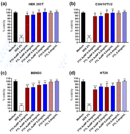 Cell viability after incubation with ferritin Au-NP compared to apoferritin. (a) HEK 293T cell line, (b) C3H/10T1/2 cell lines, (c) BEND3 cell lines, and (d) HT29 cell lines (mean ± SEM; n = 9; 3 independent experiments with 3 replications each); MTS assay. Data were analyzed using a one-way analysis of variance and Tukey’s post hoc test. Statistically significant differences are indicated (* p < 0.05; ** p < 0.01; *** p < 0.001; ns, not significant).