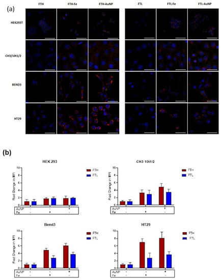 Confocal microscopy results for different cell lines after incubation with FT-AuNP. (a) Confocal images of HEK293T, CH3/10T1/2, BEND3, and HT29 were obtained after incubation for 24 h with H-ferritin (FTH) and L-ferritin (FTL), with or without AuNP or iron oxides (anti FTH or FTL in red; (DAPI) nucleus in blue; scale bars: 20 μm). (b) Plots representing fold changes in MFI (mean fluorescence intensity) ± SD from more than three independent experiments.