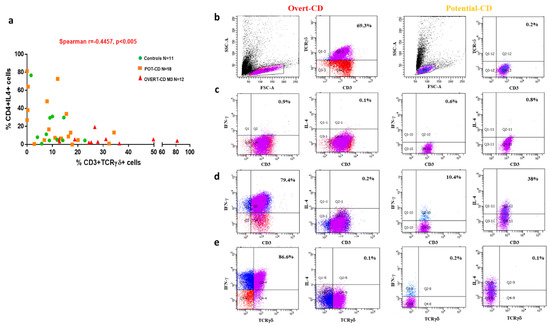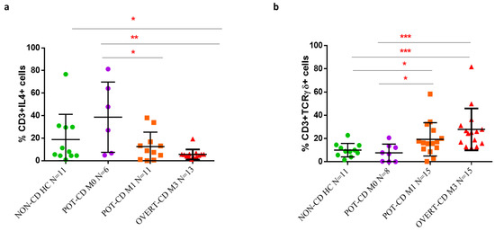 In our study, we observed a trend of increased percentage of IL4-producing T cells and decreased frequency of TCRγδ+ T cells in potential-CD with M1 stage compared to overt-CD with M3, although we did not find significant difference between the two CD patient groups. Recently, Ruiz-Ramírez et al. measured by flow cytometry our similar percentages of TCRγδ+ T cells in duodenal biopsies of a large and heterogeneous cohort of CD patients, both with M1 and M3 lesions, without finding differences between groups [