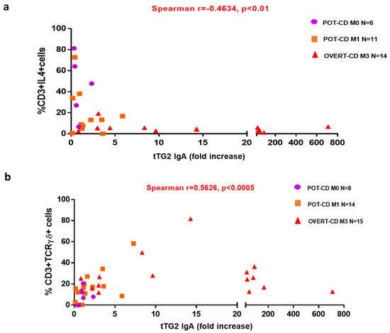 23], we calculated the correlation between the anti-tTG2 IgA antibody titres and mucosa infiltrating T-cell populations of our interest. We demonstrated that CD-autoantibodies levels were indirectly correlated with IL4+ T cells, and directly correlated with TCRγδ+ T cells in all CD patients. These correlations strongly suggest that the combined detection of intestinal frequencies of TCRγδ+ and of IL4-producing T cells could be useful to predict the evolution to villous atrophy in potential-CD patients with low levels of anti-tTG2 IgA, in particular if slightly over the cut-off. In contrast to our findings, Ruiz-Ramírez et al. reported that the percentage of TCRγδ+ T cells is not influenced by the serum levels of anti-tTG2, although the high heterogeneity of their cohort of CD patients could explain this divergence [