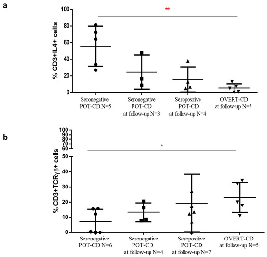 31]. Conversely, in agreement with our results, another pediatric study demonstrated that in potential-CD children, with normal or slightly high percentage of intraepithelial TCRγδ+ T cells, a high percentage of IL4-producing cells, detected by immunohistochemistry, was present in the lamina propria [