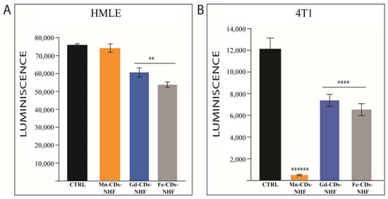 Effects of doped CDs-NHF on cell viability. (A). Normal cell line HMLE; (B). Cancer cell line 4T1. ** p < 0.05, **** p < 0.0005, ****** p < 0.00005.