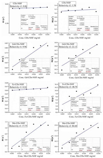 The r1 and r2 relaxivity values represent the slope of the linear regression of T1 and T2 relaxation rates (1/T1 and 1/T2, respectively) in the range of the product concentrations we have considered. The relaxivity values indicate the T1/T2 shortening ability of the tested compounds with a direct impact on the MRI contrast. According to the r1/r2 values obtained, as it can be observed from Figure 2, the Mn-CDs-NHF best meets the feature of an MRI contrast agent. In addition, in the case of Fe-CDs-NHF, the ability of the trivalent ion to provide NMR contrast in T2 sequences is confirmed by a high r2 value of 48.70 mg−1·mL·s−1, while r1 is insignificant to provide MRI contrast, of only 0.24 mg−1·mL·s−1. Since gadolinium is the only ion with clinical applicability to enhance the MRI contrast, it was considered in this study as a positive control, which was bound into the Gd-CDs-NHF in a similar manner to the rest of metal included in the prepared compounds. In such an environment, the Gd3+ ion caused relaxivity values of r1 and r2 of 9.96 and 22.13 mg−1·mL·s−1, respectively, suggesting a good ability to enhance the MRI contrast, especially in T2 sequences. Quite different is the case of Mn-CDs-NHF product, which although it has a relaxivity r2 significantly higher than all other materials tested, of 88.60 mg−1·mL·s−1, it also presents a noticeable value for r1, of 17.75 mg−1·mL·s−1, which is close to the r2 value of Gd-CDs-NHF. In such circumstances, we can infer that the Mn-CDs-NHF product is able to be successfully applied as a contrast agent in both T1 and T2 sequences, depending on what is pursued in that study. The in vitro imaging data using T1 and T2 MRI sequences are presented in Supplementary Figure S5.