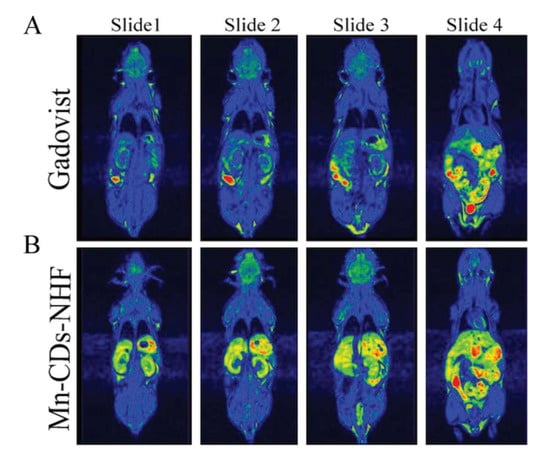 An MRI signal is much more intense in the case of the group that received the suspension of Mn-CDs-NHF in comparison with the group receiving Gadovist. There is also a very obvious uptake of the Mn2+-based compound, which is predominantly in the liver, kidneys, peritoneal cavity, and heart and much less in the brain or other regions located distant from the injection site. The images are displayed in rainbow color visualization to show as suggestive as possible the difference in MRI contrast between different tissues, while the color intensities in all the recorded images were normalized using the same brightness level in all images so that they could be compared.