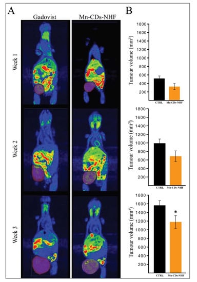 In addition to the improved MRI contrast capabilities of Mn-CDs-NHF relatively to the commercial agent Gadovist, it is also essential to notice that when compared with the control group (Figure 4A_Gadovist), the volume of the primary tumors is reduced in Mn-CDs-NHF treated group (Figure 4_Mn-CDs-NHF), as summarized in Figure 4B. These data demonstrate that the proposed teranostic agent, Mn-CDs-NHF, fulfill at the same time the role of increasing the MRI contrast as well the anti-tumor features.