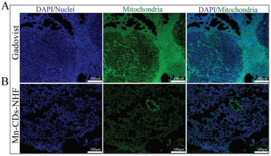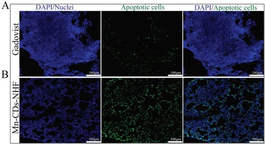 Our new data show only a few apoptotic cells in the control group (Figure 7A). The number of apoptotic cells is massively increased in the lung metastases of the Mn-CDs-NHF treated group (Figure 7B). These data sustain the in vitro cell viability data, which demonstrated reduced cell viability in the Mn-CDs-NHF-treated group relative to the Gadovist-treated group.