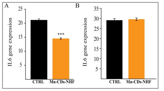 Interleukin 6 (IL-6), a pro-inflammatory cytokine, mediates pro-survival signals in cancer and inflammations. Our in vitro investigation shows that the levels of IL-6 mRNA in cancer cell treated with Mn-CDs-NHF are significantly reduced relative to Gadovist-treated cells (Figure 8A).