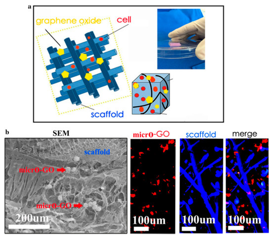 3D-printed scaffold containing graphene oxide (GO) for the cartilage layer construction. (a) Scheme of 3D-printed scaffold containing GO and chondrocytes (cells), (b) SEM and immunofluorescence in vitro evaluation of micro-GO presence in scaffold. The scaffold (in blue color) forms nets, in which micro-GO (in red color) and chondrocytes are localized. Micro-GO are flakes with length less than 100 µm. Toluidine blue and 1,1-dioctadecyl-3,3,3,3-tetram-ethylindocarbocyanine perchlorate (DiI; Sigma, St. Louis, MO, USA) were used to label micro-GO flakes within the scaffold. Adapted from [83], BMC, 2020.