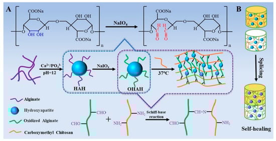 Schematic illustration of the preparation of the hydrogel based on alginate (ALG), hydroxyapatite (HA), and carboxymethyl chitosan (CM)–CS. ALG was used for the preparation of HAH hybrids, then ALG was oxidized to form oxidized OHAH hybrid. In the next step, the Schiff base reaction between OHAH and (CM)–CS was launched. The self-healing property of the hydrogel was verified using two parts of the prepared hydrogels, one of the parts was mixed with methyl orange solution. Both parts were then spliced and characterized. Scheme describes: (A) the preparation of an injectable hydrogel using Schiff base reaction via chemical reactions as well as schematically, (B) the self-healing property of the hydrogels. HAH is hydroxyapatite alginate (HA/ALG) hybrids, OHAH is oxidized alginate hydroxyapatite hybrid. Adapted from [108], Elsevier, 2017.