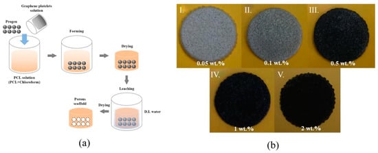 Illustrations of polycaprolactone/graphene platelet scaffolds preparation. Graphene (GR) platelets were prepared using graphite via intercalation at 700 °C for 60 s. The formed GR platelets were dispersed in trichloromethane and mixed together with NaCl (progen) with a polycaprolactone solution (PCL), stirred for 2 h, and poured into a form. After drying, the system was immersed in deionized water (D.I.) to remove NaCl and consequently dried to form a porous scaffold. Various GR amounts were used for the scaffold preparation. (a) Scheme of PCL/GR scaffold preparation and (b) scaffold samples with various contents of GR platelets I. 0.05 wt%, II. 0.1 wt%, III. 0.5 wt%, IV. 1.0 wt%, and V. 2.0 wt%. Adapted from [141], Elsevier, 2020.