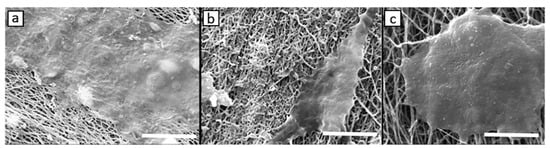 SEM images of MG-63 cell attachment and spreading on: (a) carbon nanofibrous (CNF) scaffolds without gold nanoparticles (CNF scaffold), (b) CNF scaffolds containing 2.5 wt% of gold nanoparticles (CNF/2.5% AuNPs), and (c) CNF scaffold with 5 wt% of sprayed AuNPs. Scale bar = 10 μm. Adapted from [166], Elsevier, 2020.
