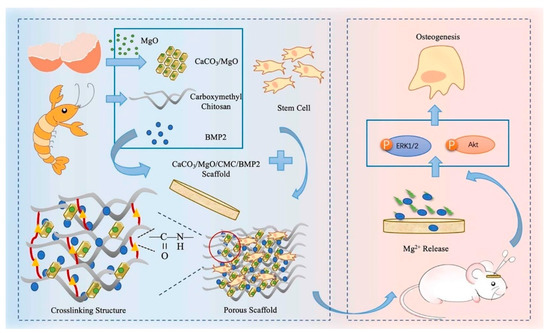 - Huang, Y.Z.; Ji, Y.R.; Kang, Z.W.; Li, F.; Ge, S.F.; Yang, D.P.; Ruan, J.; Fan, X.Q. Integrating eggshell-derived CaCO3/MgO nanocomposites and chitosan into a biomimetic scaffold for bone regeneration. Chem. Eng. J. 2020, 395, 125098. [Google Scholar] [CrossRef]