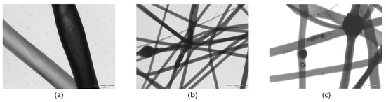 TEM microphotographs of spare electrospun fibers (scale bar 1 µm) made of B (a), 0.1 HP (b) and 0.5 HP (c) blends, showing the disposition and morphology of HP inclusion in individual fibers. Scale bar is 1 µm.