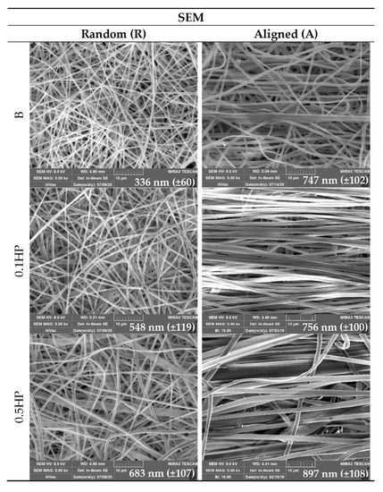Figure 2 reports the SEM images of B, 0.1 HP and 0.5 HP scaffolds in aligned tubular (A) and random (R) structure.