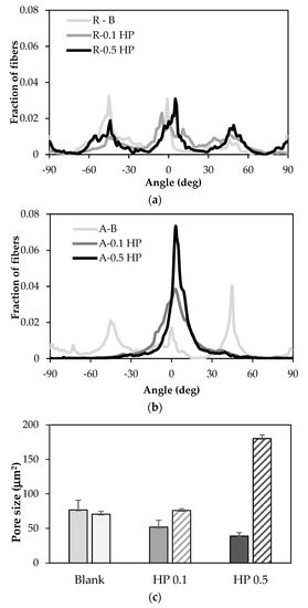 Figure 3 reports the porosity and the orientation degree of the nanofibers in the B, 0.1 HP and 0.5 HP scaffolds in aligned tubular (A) and random (R) structure, showing that both alignment and HP content affect the pore size of the scaffolds.