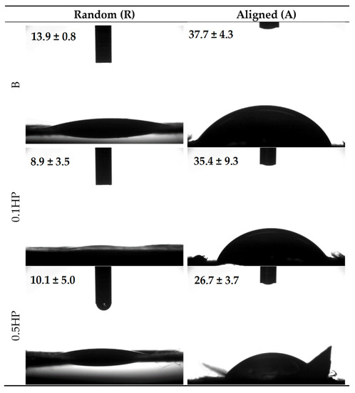 Figure 4 shows the shape and the contact angles for a 0.4 µL buffer drop released onto B, 0.1 HP, and 0.5 HP scaffolds, in the aligned tubular (A) and random (R) structures. It can be seen that the fibers alignment governs the wettability of the scaffolds, independent of the variable HP-doping, and despite the same polymeric matrix composition.