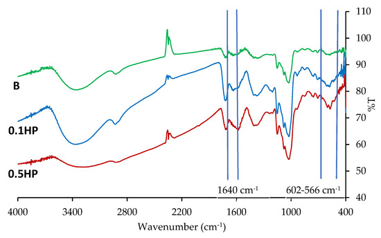 Figure 5 reports the FT-IR profiles recorded for the dry random scaffolds (R-B, R-0.1 HP, R-0.5 HP), all presenting similar patterns typical of polysaccharides. The peak in the region around 1640 cm−1, typical of the Amide I band, is likely due to covalent bonds occurring between chitosan amino groups and carboxylic moieties of citric acid [14] occurring in the crosslinking stage of scaffold preparation protocol. In the HP-doped scaffolds, characteristic vibrational bands at 602 cm−1 and 566 cm−1, arise from the HP phosphate groups [18], as expected.