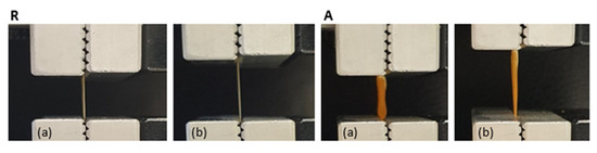 Macroscopic pictures of random (R) and tubular aligned (A) scaffolds at relaxed (a) and elongated state (b).