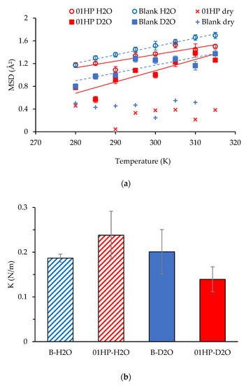 As seen in Figure 8, panel a, the scaffold local mobility is also released upon wetting with either H2O or D2O. Measurements performed in D2O (squares), enhancing the visibility of un-exchangeable hydrogens, show that the MSD of molecules is more than doubled in the wet condition, an extent that is further enlarged if all hydrogens are accounted for (H2O wetting, circles). Seemingly, the un-exchangeable hydrogens of the HP-free scaffold are more resilient (higher K value, Figure 8, panel b) than the ones in the HP-doped scaffold, where the intercalation of HP nanoparticles might locally impede compaction of the polysaccharide chains.