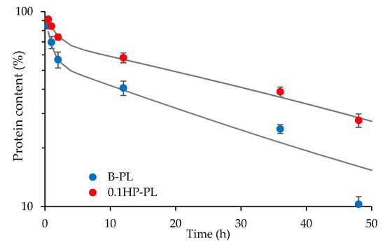 Blank and HP-doped tubular aligned scaffolds, B and 0.1 HP, were tested for their capability to control the permeation of proteins of the platelet lysate (PL). In fact, the tubular structure was intended to achieve controlled and prolonged GF action over time, by loading PL into the inner cavity. As reported in Figure 9, both scaffolds allowed for PL proteins’ diffusion across the scaffold walls over quite long times. In both cases, a fast permeation, in the first 2 h, is followed by a slower one, reaching substantial protein release in 48 h. Data can be fitted by a double exponential time-decay, as in the presence of fast- and slow-diffusing proteins in PL. Both components suggest that diffusion is slower in the HP-doped scaffold than in the blank one, although the pore size is similar (Figure 3).