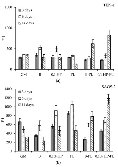 In view of the application of aligned tubular scaffolds in the repair of the osteo–tendon interface, two cell lines were selected as representatives for tendon and bone cells, namely TEN-1 and SAOS-2, and grown onto the aligned scaffolds (B, 0.1 HP). Their metabolic activity, directly related to their viability, was assessed at increasing time-delays over 14 days from seeding and is reported in Figure 10, in terms of fluorescence intensity, F.I. In parallel experiments, cells were also grown in the absence of any scaffold, for comparison, as hereafter detailed.