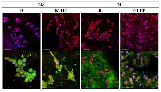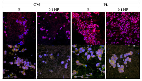 CLSM images of SAOS-2 grown onto the aligned scaffolds (B and 0.1 HP) after 14 days with or without platelet lysate (PL) (PL 1:20 dilution in growth medium, GM). Actin stained in red, nuclei stained in blue and sialoprotein stained in green (magnifications: 40× upper row or 63× lower row).