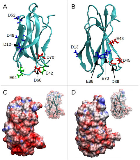 Figure 1. High-affinity residues and electrostatic potential of PL1 binding partners. (A) structure of FN-EDB showing three areas of charged residues, (1) D52, D49, and D12; (2) D68 and D70; and (3) E42, D68, and E64. (B) structure of TNC-C showing three areas of charged residues, (1) D13, E70 and E88; (2) D39 and D45; (3) E48. (C) electrostatic potential surface of FN-EDB (red represents regions with a negative potential, while blue represents positive ones); the inset shows the cartoon representation of the protein. (D) electrostatic potential surface of TNC-C.