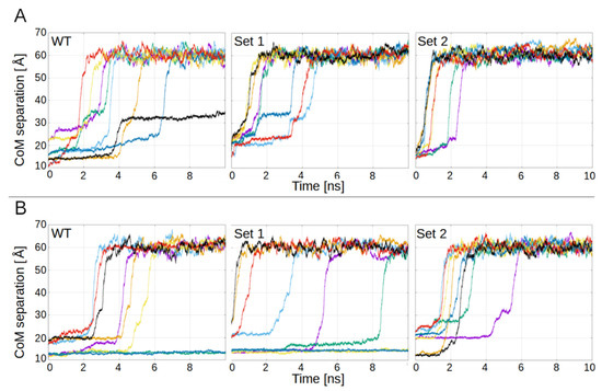 Figure 2A shows the separation between the center-of-mass (CoM) of FN-EDB and PL1, as a function of simulation time. Each curve represents a different starting pose. Comparing the panels, the unbinding is stronger (occurs faster) in Set 2, takes more time in Set 1, and even more time in the WT. This shows that, whereas the mutations in Set 1 favor unbinding (as compared to the WT), the mutations of Set 2 (which includes Set 1) favor it even more.