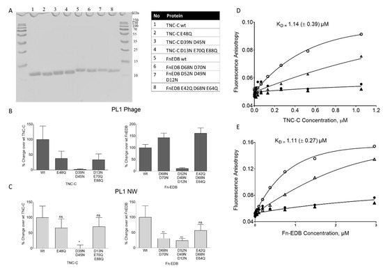 Figure 3. WT and mutant FN-EDB and TNC-C: binding of PL1 peptide NPs and free peptide. (A) The WT and mutant FN-EDB and TNC-C isoforms were expressed in E. coli. Coomassie blue-stained SDS PAGE of His-tagged recombinant proteins (loading scheme listed in the table) after purification on HisTrap HP columns; (B) binding of the PL1 peptide phage to immobilized TNC-C and FN-EDB isoforms. The phage binding is expressed as percent binding over parental WT FN-EDB and TNC-C; (C) binding of FAM-labeled PL1-NWs to NiNTA beads immobilized recombinant TNC-C and FN-EDB proteins. The mutant TNC-C (D39N, D45N) and FN-EDB (D52N, D49N, D12N) showed a ~100% and ~76% reduction in binding over WT protein. The PL1-NW binding is expressed as percent binding over parental WT FN-EDB and TNC-C proteins after baseline correction with control protein P32. The binding data are representative of three independent experiments. Error bars: mean ± standard error of the mean (SEM), ns p > 0.05, * p ≤ 0.05, ** p ≤ 0.01. (D,E) Binding curve characterizing PL1 peptide binding to TNC-C and FN-EDB. FAM-PL1 [0.468 µM (circles) and 4.68 µM (triangles)] was incubated with different concentrations of TNC-C (D) and FN-EDB (E) in the absence (total binding, open symbols) or presence (non-specific binding, filled symbols) of 0.5 mM biotin-PL1. After incubating 24 h at 25 °C, FA values were measured, and binding parameters were calculated as described in Materials and Methods. Data are representative of three independent experiments.