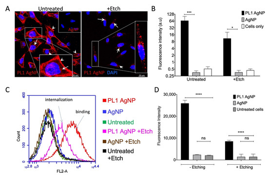 Figure 4. Cellular uptake of PL1-AgNPs. Binding and cellular uptake of PL1 or biotin-blocked CF555-labeled AgNPs in U87-MG cells was assessed by confocal imaging and flow cytometry. (A) Confocal microscopy of U87-MG attached cells incubated with PL1-AgNPs or control AgNPs. U87-MG cells show binding of CF555-labeled PL1-AgNP (red) to the cell surface (white arrowheads), whereas cells incubated with control particles are negative. The etched CF555-labeled PL1-AgNPs show that PL1-targeted particles are able to internalize into the cell cytoplasm (blow-up image shown in box) compare to non-targeted particles. Scale bars: 20 µm (main images) and 2 µm (insets); (B) Binding and internalization into cells was quantified based on CF555 signals in (A) of representative images (mean fluorescence intensity). Error bars: mean ± SD (N = 12), * p ≤0.05, *** p ≤ 0.001; (C) flow cytometry of U87-MG cells incubated with AgNPs for 1 h with ± etching. CF555-gated plot showing cell binding and internalization of PL1-AgNP (red: − etch; pink: + etch) compared to control particles AgNP (blue: − etch; brown: + etch). The cells without AgNPs were included as a control standard (green: − etch; block: + etch). (D) Quantification of flow cytometry data were represented as % over control cells without AgNPs, p-value was determined by one-way ANOVA, Error bars: mean ± SEM (N = 3), ns p > 0.05, * p ≤ 0.05, **** p < 0.0001.