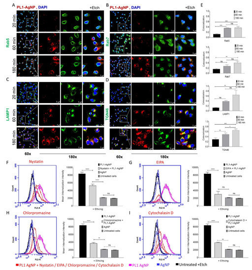 Figure 5. Colocalization of PL1-functionalized silver nanoparticles (AgNPs) with endocytic markers, and inhibition of endocytosis pathways in U87-MG cells. Confocal microscopy images of U87-MG attached cells incubated with PL1-AgNPs (red) at 20, 60, and 180 min time points, and cells were treated by etching solution to visualize only internalized particles. The cells were stained with (A) early endosome marker Rab 5A (green); (B) late endosome marker Rab 7A (green); (C) lysosome marker LAMP-1 (CD107a; green); and (D) trans-Golgi network marker TGN46 (green). The cells were counterstained with DAPI (blue). Scale bar: 20 μm (60×), for the magnified images 5 μm (180×). (E) The relative colocalization was assessed with Manders coefficient (M2) using ImageJ software and shown in the bar chart. Internalized PL1-AgNP colocalization with markers was quantified from representative images using a one-way ANOVA test. Error bars: mean ± SD (n = 3, three independent experiments), ns p > 0.05, * p < 0.05, ** p < 0.01, *** p < 0.001, **** p < 0.0001. For the FACS analysis, U87-MG cells were pre-incubated with inhibitors of endocytic pathways, 50 μM Nystatin (F), 1 mM 5-(N-ethyl-N-isopropyl)-Amiloride (EIPA) (G); 10 μM Chlorpromazine (H); 4 μM Cytochalasin D (I); and untreated cells as control, and AgNPs for 30 min. The cells were incubated with PL1-AgNPs for 60 min, and cells were treated by etching to remove membrane-bound particles. The cells were analyzed with flow cytometry for inhibition of uptake. CF555-gated plot showing cell internalization and inhibition of PL1-AgNPs (pink: internalization; red: inhibition) compared to control particles AgNP (blue). The cells without AgNPs were included as a control standard (black). The BD Accuri C6 software was used for the quantification of cell mean intensity from three independent experiments. The bar chart showing one-way ANOVA test, Error bars: mean ± SD (N: 1000 cells/experiment), ns p > 0.05, * p < 0.05, ** p < 0.01, *** p < 0.001, **** p < 0.0001.