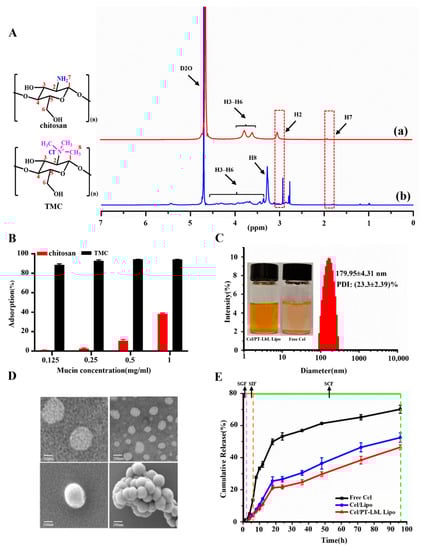 Characteristics of TMC polymer and Cel/PT-LbL Lipo. (A) 1H NMR spectra of chitosan (a) and TMC (b). (B) Mucoadhesive activity of chitosan and TMC with mucin. (C) Size distribution and appearance of Cel/PT-LbL Lipo suspension. (D) Representative TEM (upper row) and SEM (bottom row) images of Cel/PT-LbL Lipo. Scale bar = 200 nm. (E) In vitro release profiles of Cel from Free Cel, Cel/Lipo, and Cel/PT-LbL Lipo in three simulated GI tract mediums at 37 °C.