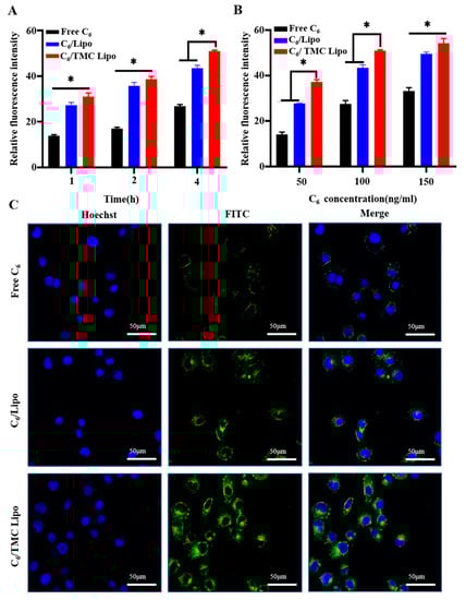 First, we used flow cytometer (FCM) to quantitatively analyze the cellular uptake profiles of various C6 formulations after incubation with NCM460 cells for either different times or with different C6 amounts. As shown in Figure 2A, cellular uptake of all C6’s formulations occurred in a time-dependent manner. The intracellular amounts of C6 gradually increased with increasing incubation time. Even so, C6/TMC Lipo exhibited much stronger cellular uptake capacity than others. The enhanced uptake of C6/TMC Lipo was attributed to the positive charge of the TMC layer. Additionally, Figure 2B shows that more C6 was internalized into NCM460 cells for C6-loaded Lipo versus Free C6 at C6 concentration of 50~150 ng/mL. Similarly, based on the potential positive charge derived from TMC layer, C6/TMC Lipo also exhibited significantly enhanced cellular internalization, compared with either Free C6 or C6/Lipo. These consequences indicated that the Lipo-regulated cellular uptake of C6 was also both time- and dose-dependent.