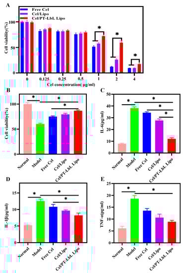 In vitro cytotoxicity and anti-inflammatory activity of Cel/PT-LbL Lipo on NCM460 cells induced by DSS. (A) Cell viability of NCM460 cells treated with various Cel formulations at a series of Cel concentrations (0–4 μg/mL) for 24 h. (B) Effects of various Cel formulations on cell viability of NCM460 cells induced by DSS. The expression levels of IL-6 (C), IL-1β (D), and TNF-α (E) in NCM460 cell culture medium, which were treated by various Cel formulations, meanwhile induced by 30 mg/mL DSS for 24 h. ANOVA, Dunnett’s test; * p < 0.05.