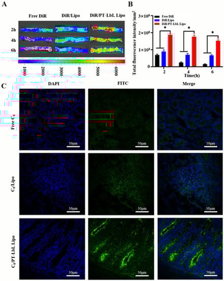 Mediated by the single-pass intestinal perfusion system, Free 1,1′-dioctadecyl-3,3,3′,3′-tetramethylindotricarbocyanine iodide (DiR) suspension, DiR/Lipo, and DiR/PT-LbL Lipo were syringed into the colon loop to mimic the enteric canal transmission in colon peristalsis. As shown in Figure 4A,B, the adhered fluorescence in the Free DiR group was weak and declined rapidly during 6 h of dynamic perfusion. Increased fluorescence was observed on the colon mucus after the administration of DiR/Lipo than Free DiR, with a slow decline in fluorescence. During the 6 h perfusion, the fluorescence intensity in the DiR/Lipo group was maintained. More importantly, the fluorescence intensity on colon mucus in the DiR/PT-LbL Lipo group was evidently much stronger than either the DiR/Lipo or Free DiR at each timepoint (* p < 0.05). Similarly, the fluorescence intensity in the DiR/PT-LbL Lipo group was not notably reduced, indicating that PT-LbL Lipo possessed good adhesion on inflammatory mucosa.
