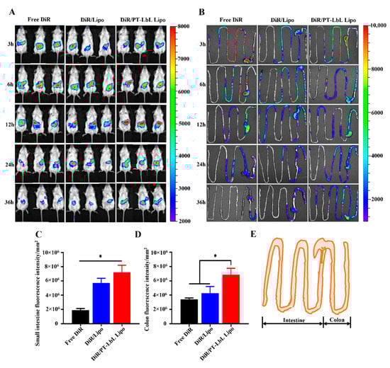 In vivo bio-distribution of PT-LbL Lipo. (A) After oral administration of Free DiR, DiR/Lipo, and DiR/PT-LbL Lipo at 3, 6, 12, 24 and 36 h, whole mouse body images were observed using a PerkinElmer IVIS Spectrum system. (B) Fluorescence retention images of small intestine and colon tissues following excision from UC mice at 36 h post-administration. (C) Fluorescence intensity quantification of small intestine across each preparation at the final endpoint. (D) Quantification of colon of ulcerative colitis mice across each preparation at the final endpoint. (E) Simulation diagram of the harvested intestine and colon tissue. ANOVA, Dunnett’s test; * p < 0.05.