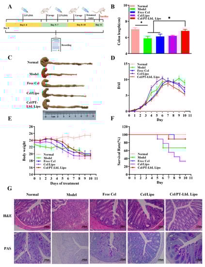 In vivo therapeutic outcomes of Cel/PT-LbL Lipo in DSS-induced UC mice model. (A) The graphical scheme of mice administration approach. UC mice model was induced by free drink of DSS solution (3.0%, w/v). At day 3, Free Cel (1 mg/kg), Cel/Lipo (0.5 mg/kg) and Cel/PT-LbL Lipo (0.5 mg/kg) were orally administered daily for a week. (B) Colon length; Statistical significance was assessed (* p < 0.05). (C) Representative colon photographs; (D) DAI scores; (E) Mice bodyweight curves during the whole experiment; (F) Survival rates; (G) H&E and PAS staining of colonic sections in different groups.
