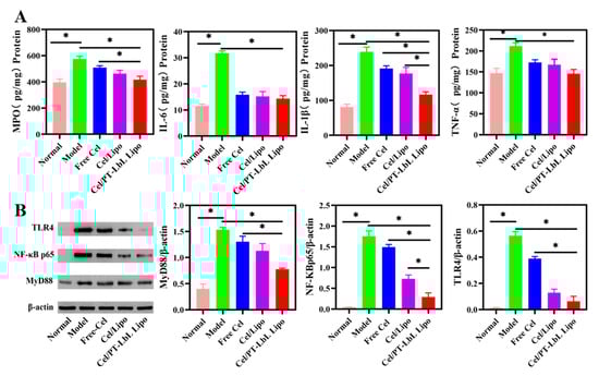 It has been reported that inflammation severity is correlated with the amounts of pro-inflammatory cytokines [37]. As shown in Figure 7A, the secretion levels of major pro-inflammatory cytokines (e.g., MPO, IL-6, IL-1β, TNF-α) in the Model group were obviously higher than those in the Normal group. However, treatment with Cel/PT-LbL Lipo effectively reduced the levels of pro-inflammatory cytokines, while other treatment groups showed a slight decrease.