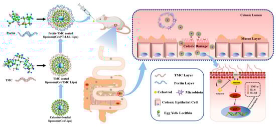Schematic illustration of Cel/PT-LbL Lipo working against UC in mice. Oral administration delivery of pectin-TMC coated liposomes acts against UC by protecting the colonic epithelial cells from damage and anti-inflammation.