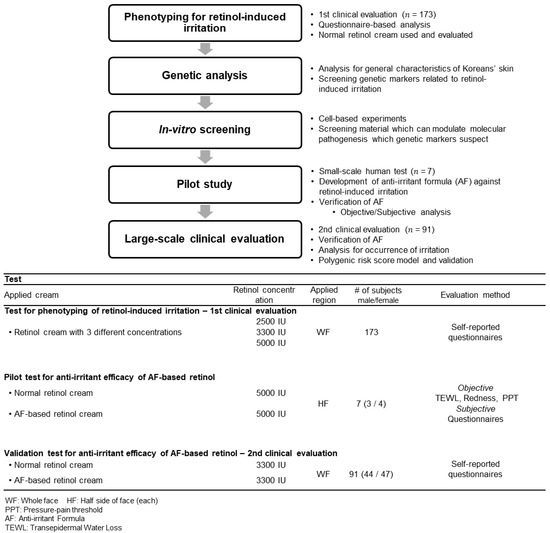 This study was designed as shown in Figure 1. Briefly, phenotyping for retinol-induced irritation from the 1st clinical evaluation of 173 Koreans was performed. Through genetic analysis, genetic markers were screened, and anti-irritants and formulas were investigated. Following, a small-scale pilot study (n = 7) and large-scale clinical evaluation (2nd, n = 91) were performed to verify the anti-irritant efficacy of the newly developed formula.