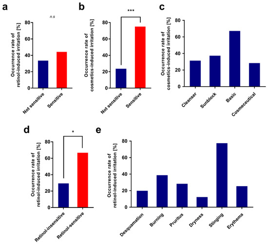 Bar plots depicting the analysis of questionnaires following the test with retinol cream. (a) The proportion of individuals who experience irritation to retinol cream according to self-reported skin sensitivity. (b) The proportion of individuals who have stopped using cosmetic products due to irritation according to self-reported skin sensitivity. (c) The proportion of individuals who experience irritation when using basic cosmetic products. (d) The proportion of individuals with a past experience of irritation to retinol-containing products. (e) The types of irritation that individuals have experienced during use of retinol-containing topical products; * p-value < 0.05; *** p-value < 0.001; n.s, not significant.