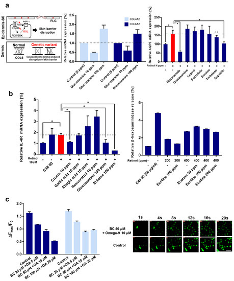 The analysis for mRNA expression to screen anti-irritants that could modulate irritation-associated molecular pathogenesis. (a) Investigation for skin barrier disruption-associated molecular pathogenesis. Schematic diagram for the approach for genetic modulation for retinol (ROL)-induced skin barrier disruption. (left) The relative mRNA expression of COL4A2 and COL6A2 when fibroblasts were treated with glucosamine (middle) and relative mRNA expression of AQP3 (keratinocyte, right). (b) Investigation for inflammation (mast cell driven)-associated molecular pathogenesis. Relative mRNA expression of IL-4R when RBL-2H3 was treated with 10 µM retinol and various candidates. (c) Neurogenic inflammation mediated with TRPV1 induced by retinol and antagonistic effect by 4-t-butylcyclohexanol and omega-9; Three conditions for combination: (1) 4-t-butylcyclohexanol 25 μM and omega-9 5 μM, (2) 4-t-butylcyclohexanol 50 μM and omega-9 10 μM, and (3) 4-t-butylcyclohexanol 100 μM and omega-9 20 μM, BC, 4-t-butylcyclohexanol; OA, omega-9 oleic acid; A 50 µm scale bar (white) was shown; * p < 0.05; n.s, not significant; error bar was shown; ppm, parts per million.