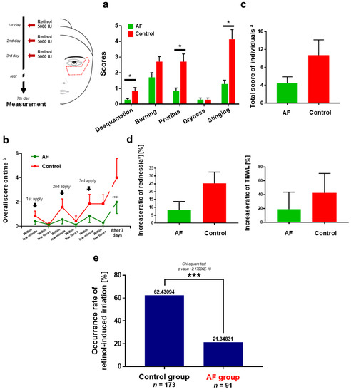 Schematic and plots depicting the anti-irritant efficacy of AF. Panel (a–d) indicate the results of the small pilot study (n = 7). Left schematic diagram shows the test schedule and procedure and test area (red dotted) results of the face that was evaluated for the measurement of TEWL and skin redness. (a) Average of the irritation scores that the test subjects experienced during the test period. (b) Overall irritation score on each time point. Over irritation score b refers to the sum of scores of all types of irritation experienced by the individuals. (c) Total irritation score of the individuals. Total scores a for each type of irritation experienced by the individual during the test period were averaged. Overall scores b on each time point were summed. (d) Skin redness and transepidermal water loss (TEWL) measured by chromameter and tewameter. The increased ratios (%) for individuals were averaged. (e) Occurrence rate of retinol-induced irritation. Test human subjects were asked a dichotomous question, whether “retinol-based cream is irritant or not”, based on their own subjective criteria. A chi-square test was performed to investigate statistical significance. (p-value: 2.17906E-10); * p-value < 0.05; *** p-value< 0.001; AF, Anti-irritant Formula against retinol-induced irritation; error bars are shown.