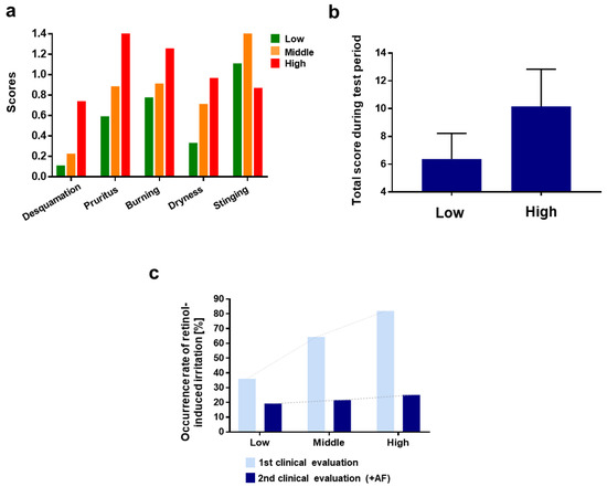 The test subjects of the second large-scale clinical test were arbitrarily categorized into three groups: high (>75, 31 individuals), middle (65–75, 33 individuals), and low risk score (<65, 27 individuals) (Figure S3, see Supplementary Materials). As characteristics of retinol-induced irritation in each group, the high-risk score group exhibited dryness and desquamation after the last third treatment of retinol compared to the other groups (Figure S4, see Supplementary Materials). This result supports our hypothesis that skin barrier disruption with increased TEWL plays an important role in retinoid-induced irritation, as SLS exhibited similar clinical features and anatomical changes [63].