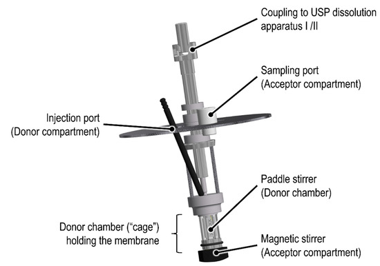 To date, there are several dialysis-based quality control methods established that enable a highly selective separation of fine particles from the release medium [9]. Among others, the Float-A-Lyzer® (Repligen, Waltham, MA, USA) in combination with USP dissolution apparatus I/II, the USP apparatus IV Dialysis Adapter (Sotax AG, Aesch, Switzerland), and the Pharma Test Dispersion Releaser (PTDR) (Pharma Test Apparatebau AG, Hainburg, Germany) have been described. Initially developed by Wacker and Janas at Goethe University [10], the commercial PTDR (Figure 1) is manufactured by Pharma Test Apparatebau AG (Hainburg, Germany). It is used in combination with a USP dissolution apparatus I/II. While the donor compartment is formed by a small cage holding the dialysis membrane (Figure 1), the dissolution vessel represents the acceptor compartment. The donor and acceptor compartments are constantly agitated at a similar rate.