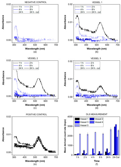 Membrane integrity test using a dispersion of gold nanoparticles (λmax = 535 nm). The samples were analyzed by UV-VIS spectrophotometry at a wavelength of 300–700 nm. The negative control was measured without adding gold nanoparticles (a) while the positive control involved an incision through the membrane before starting the experiment (e). For all other vessels (b–d), the gold nanoparticles were added to the vessel and the spectrum was recorded at the indicated time points. After 24 h, a small incision through the membrane was performed. The spectra indicating the presence of gold nanoparticles in the acceptor compartment were highlighted in black for all vessels. Additionally, the mean derived count rate in the acceptor compartment was measured indicating the presence of gold nanoparticles in all vessels after the incision but not before this time point, except for the positive control (f).