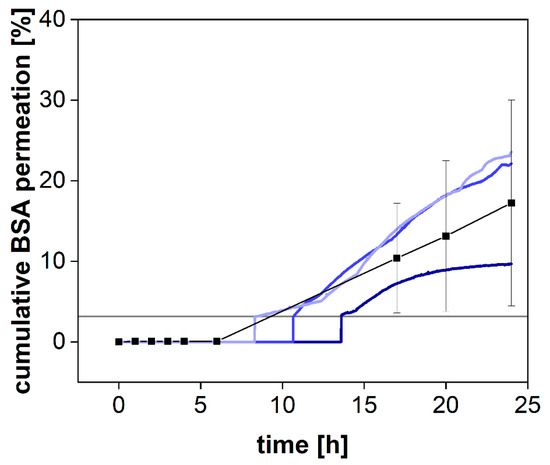 Cumulative permeation of bovine serum albumin (BSA) using SEC-HPLC method (black squares, Mean ± SD, n = 3) or an online UV-VIS dip probe (blue colored lines) at 37 °C and 50 rpm using a 50 kDa RC dialysis membrane. The horizontal grey line denotes the LOQ of the UV-VIS measurement.