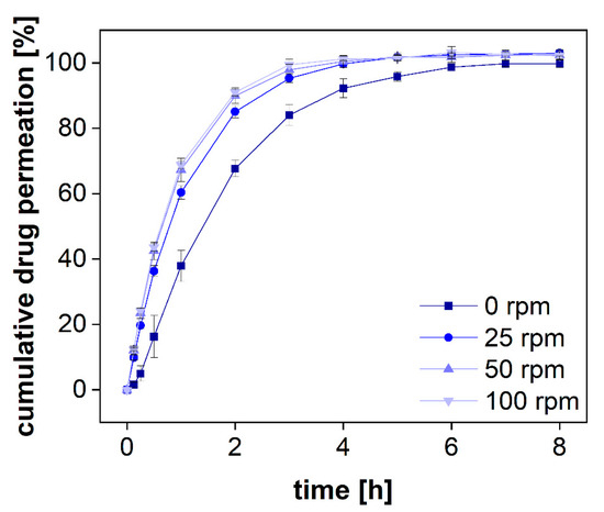Consequently, agitation of the acceptor compartment is required for the performance test. However, considering a common sampling time of 2.5–5 min, all stirring rates (25–100 rpm) enable accurate detection of the drug release.