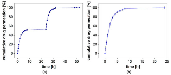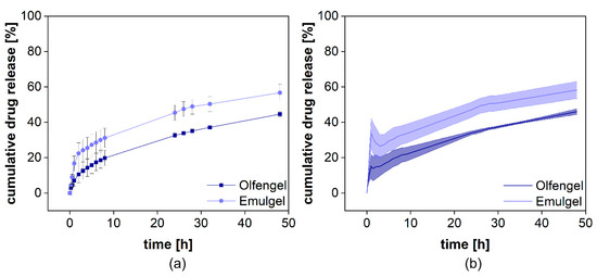 The cumulative drug release from both formulations is presented in Figure 8a. Voltaren® Emulgel released diclofenac more rapidly compared to the Olfen® gel and, within 48 h, reached a plateau at almost 60%, corresponding to the aqueous solubility determined for this release medium at 32 °C (0.0314 ± 0.0008 mg/mL for diclofenac sodium and 0.0332 ± 0.0020 mg/mL for diclofenac-DEA). Olfen® gel released the drug much slower and reached a plateau at approximately 40%. The emulsifying agents present in Voltaren® Emulgel as well as the improved solubility of diclofenac-DEA are the most likely explanation. A delaying effect of the emulsion system on dialysis could not be detected. Furthermore, it is unlikely that, when using the highly soluble salt of diclofenac, the emulsion system had a strong impact on the drug release.